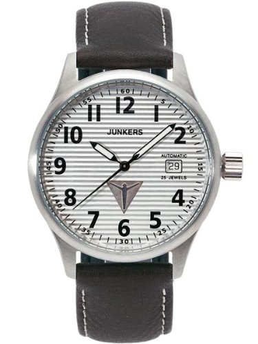 The unique dial on this model is a "corrugated sheet" design reminiscent of the material used in the Junkers aircraft. It is an automatic watch with 25 jewel, Swiss made ETA 2824-2 movement with luminescent hands, a date window, contrasting black numerals and scratch resistant sapphire crystal. Features the silver Junkers logo at 6:00 position. Packaged in original Junkers tin. Case: Solid stainless steel, 40mm diameter (w/o crown), screw down exhibition back. Band: Black leather with a buckle closure, 20mm. Water Resistant: 5 ATM Warranty: 2 Years